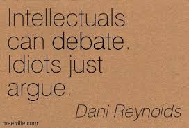 To be perfectly honest, I don't know Dani Reynolds. However, I think they bring up an interesting idea regarding the nature of communication in disagreements. Reynolds' claim, a vital piece in any debate, is that smart people debate while idiots just engage in a shouting match. While the choice of words could be considered a bit crass and, therefore, not particularly effective argumentation, Reynolds succinctly summarizes a key difference between true communication and simple noise during disagreements. All too common is the stereotypical argument depicted by Hollywood with screaming and flying objects as a result of extreme emotion and an acute lack of self-control. Such fights certainly do not lead to an intelligent discussion or beneficial solution. "Idiot" is a derogatory term, generally branding someone as a fool or lacking mental ingenuity. Reynolds clearly associates "idiots" with arguing, perpetuating the idea that arguing is simply loud yelling and irrationality. For its purpose, Reynolds' pointed choice of words is effective as it draws from the audience's preconceived definition of arguing and debating.
